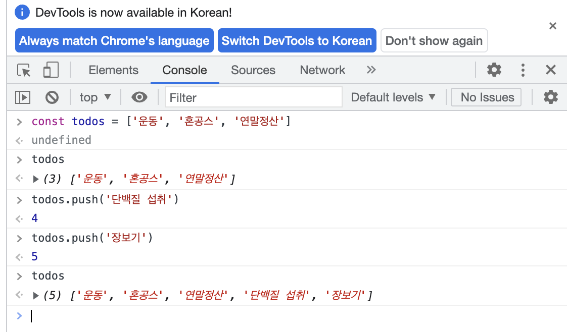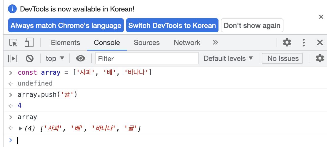 👉 배열 뒷부분에 요소를 추가할 때는 push() 메소드를 사용합니다.